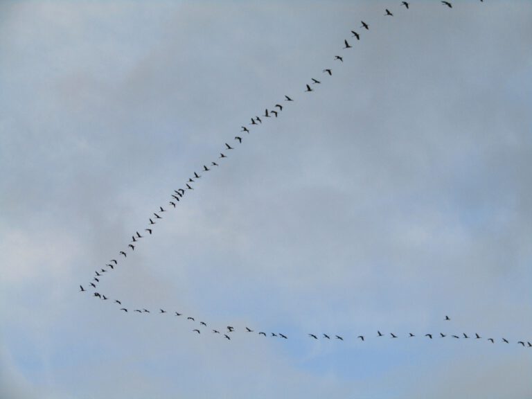 Wir sehen diese seltsamen dreieckigen Formationen am Himmel und vernehmen ihren charakteristisches tromptenhaften Ruf. Immer wieder schwingt sich dieses Dreieck am Himmel auf, bis es schließlich am Horizont verschwindet, um Platz zu machen für die nächste Gruppe, die wieder kreist und trompetet. Warum schreien Kraniche im Flug? Wir sind sind fasziniert von der Ordnung die wir sehen. Vom geheimnisvollen Prinzip der Kommunikation, das dahinter steckt. Wir sehen diese Gebilde von Riesenvögeln und hören ihre starken Stimmen. Dann fragen wir uns manchmal: „Wie machen die denn das?“ – Und denken auch: „Das will ich auch.“ So harmonisch in einer Gruppe zu schwingen, wo jeder seinen Platz kennt und doch jeder Platz immer wieder neu entworfen wird. Und die Reise geht gemeinsam nach Süden und gemeinsam wieder zurück.